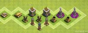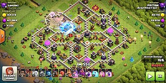 There are a number of buildings available to the player to defend their village, including cannons, mortars, archer towers, wizard towers, Inferno towers, an Eagle artillery, Scattershots, Monoliths, air defenses, spell towers, the clan castle, multi archer towers, and ricochet cannons. There are also traps including Tesla towers, bombs, giant bombs, tornado traps, seeking air mines, and air bombs. Players can also build walls, which can be upgraded further as a player’s town hall level increases. As the Town Hall level increases, the player gets access to stronger buildings such as the Monolith, the Eagle artillery, and the inferno towers.